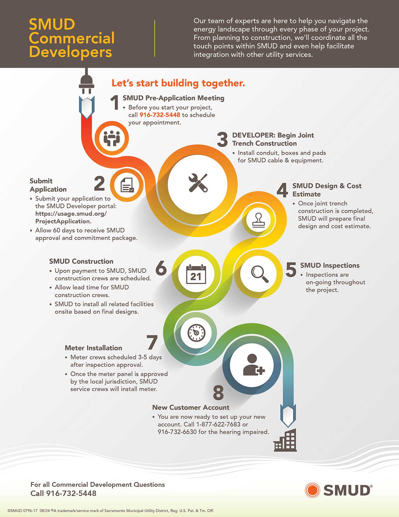 El equipo de Desarrollo Comercial de SMUD es un recurso para nuestros principales clientes desarrolladores en la planeación, coordinación y conexión de su proyecto a nuestra red. Somos su socio de servicios públicos vitales en el pre, durante y post desarrollo de su proyecto.