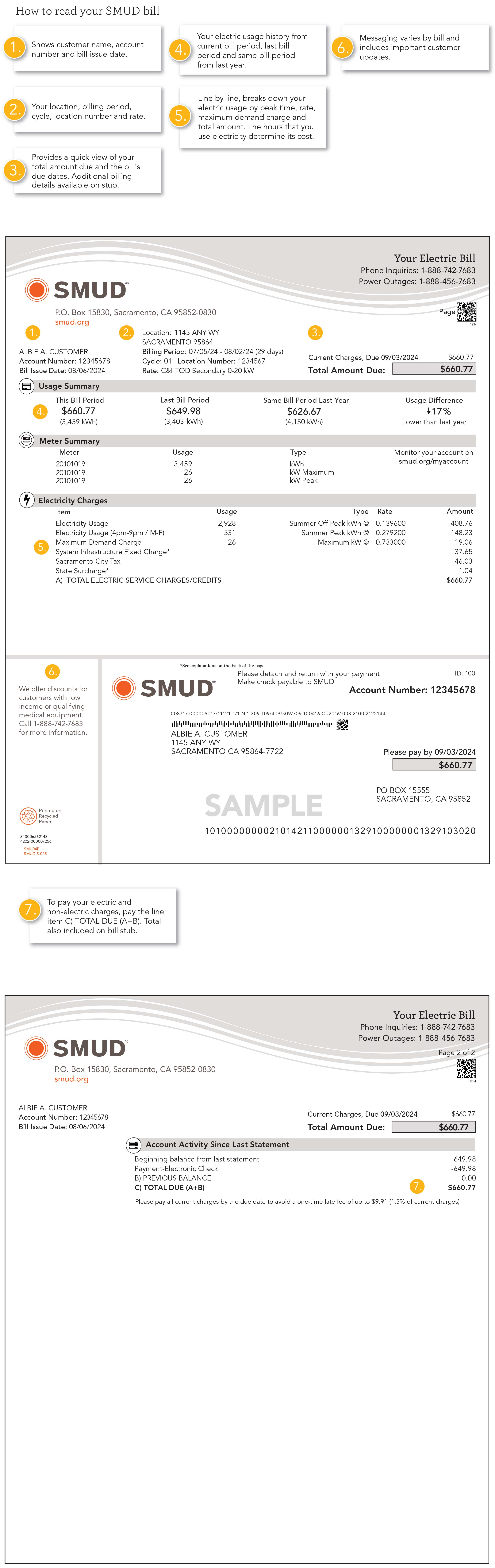 Este es un ejemplo de una factura de energía solar cuando eliges pagar tu consumo de electricidad mensualmente. Es posible que las partidas de la factura de muestra no coincidan con todas las partidas de su factura de energía solar debido a la variabilidad de las opciones de generación y facturación de energía solar.