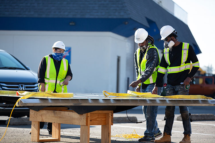 達斯蒂·貝克(下)和兩名學生在大薩克拉門托城市聯盟大樓附近安裝太陽能電池板。 |