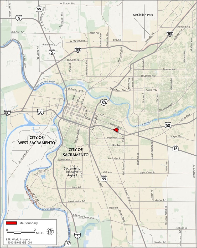 Lub 59th Street Corporation Yard Demolition and Remediation Project yog nyob rau sab hnub tuaj Sacramento, ntawm 1708 59th Street. Nws yog ciam teb los ntawm kev tsim kho vaj tse nyob rau sab hnub poob, kev lag luam kev lag luam mus rau sab qaum teb, lub chaw kuaj mob hauv California Department of Transportation (Caltrans) mus rau sab hnub tuaj hla 59th Street thiab US Highway 50 (US 50) mus rau sab qab teb. Lub tsev kawm ntawv yog bisected los ntawm Sacramento Regional Transit District lub teeb rail kab.