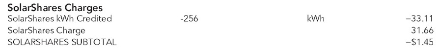 SolarShares துணைத்தொகை: SolarShares கிரெடிட் மற்றும் SolarShares கட்டணம் ஆகியவற்றுக்கு இடையேயான வித்தியாசம், மாதத்தின் பில்லில் மொத்த கிரெடிட் அல்லது கட்டணம் உள்ளதா என்பதை உங்களுக்குத் தெரிவிக்கும்.