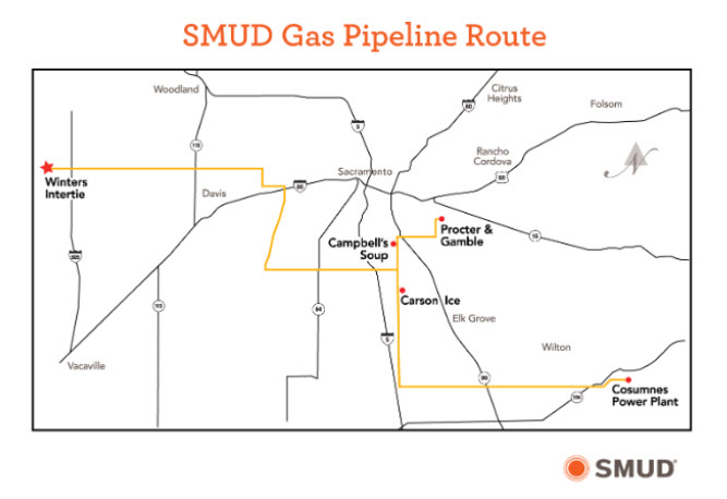 Chúng tôi sở hữu và vận hành 76 dặm đường ống dẫn khí đốt tự nhiên, cung cấp nhiên liệu cho 4 nhà máy điện SMUD ở phía nam Quận Sacramento. Bản đồ này hiển thị vị trí đường ống của chúng tôi, chạy từ gần Winters ở Quận Yolo đến Rancho Seco ở phía nam Quận Sacramento.